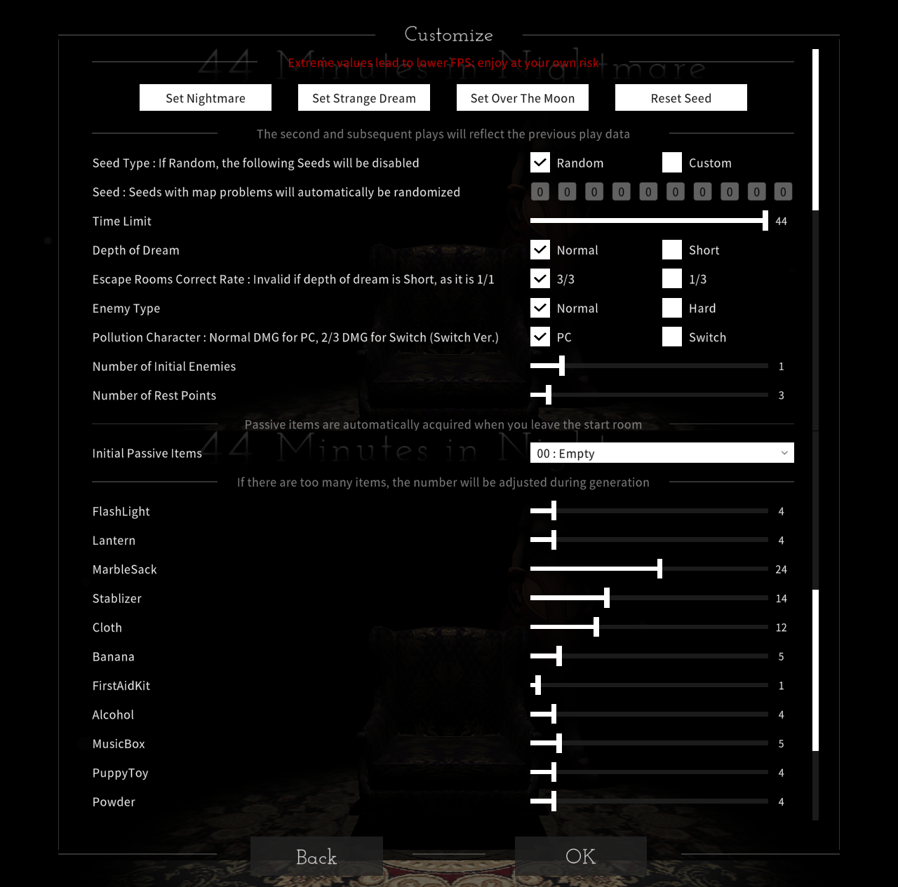 It can be opened by clearing certain conditions. If the number of items generated is extremely high, it will lead to a drop in FPS, so please enjoy the game at your own risk considering your PC specs. Also, if you play the game once and return to the title, the contents of the customization will be reflected directly in what you have played.