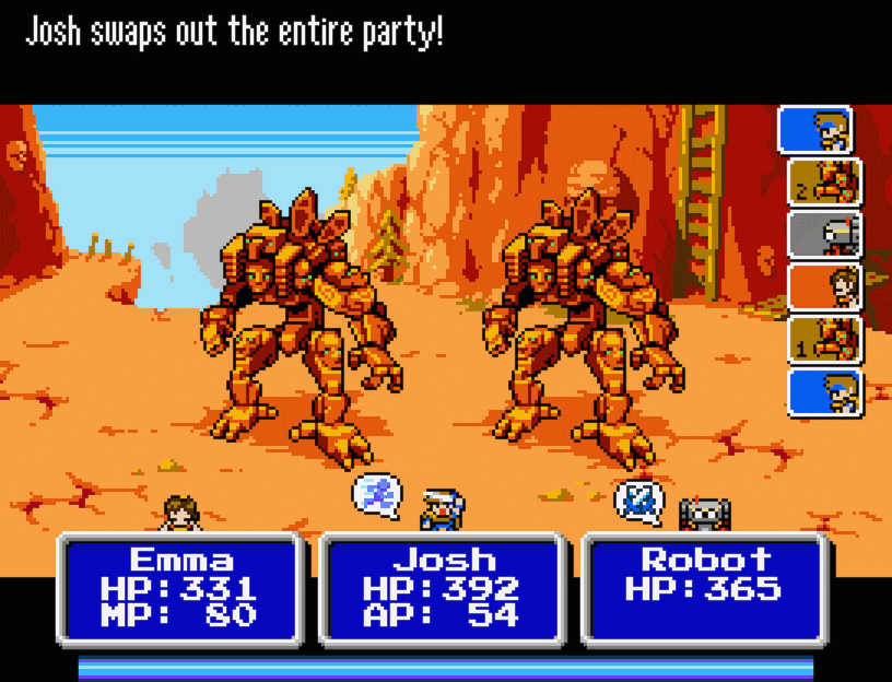 It's hard to show in a single post, but Swapping adds an extra layer of strategy to combat in 8-Bit Adventures 2, and makes late game battles feel very dynamic! Plus everyone in the party always earns full EXP from battle š