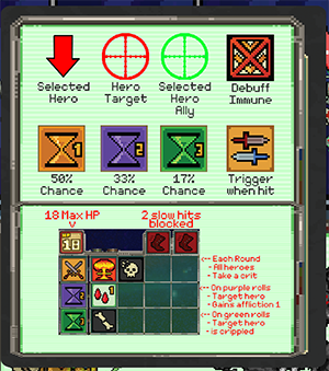 Here is the list of changes: - Can now Shift-Click on Heroes to see their card at any point during an assault - Tooltips display HP, name, status effects, and target on Heroes and Enemies - Reworked Tooltip's screen positioning (more changes planned visually) - Going into and out of fullscreen mode by pressing Alt-Enter will now allow you to resize the window without significantly impacting the gameplay graphically. - Changed the Combat Help Menu, removed the game sequence, and added another reference sheet. A screenshot of the new sheet is below: - Added tooltips to the settings menu to help with confusion. - Updated the tutorial with a few more tips/tricks. Plans to add more and more to this walkthrough in the coming weeks. - Made most text skippable in the tutorial
