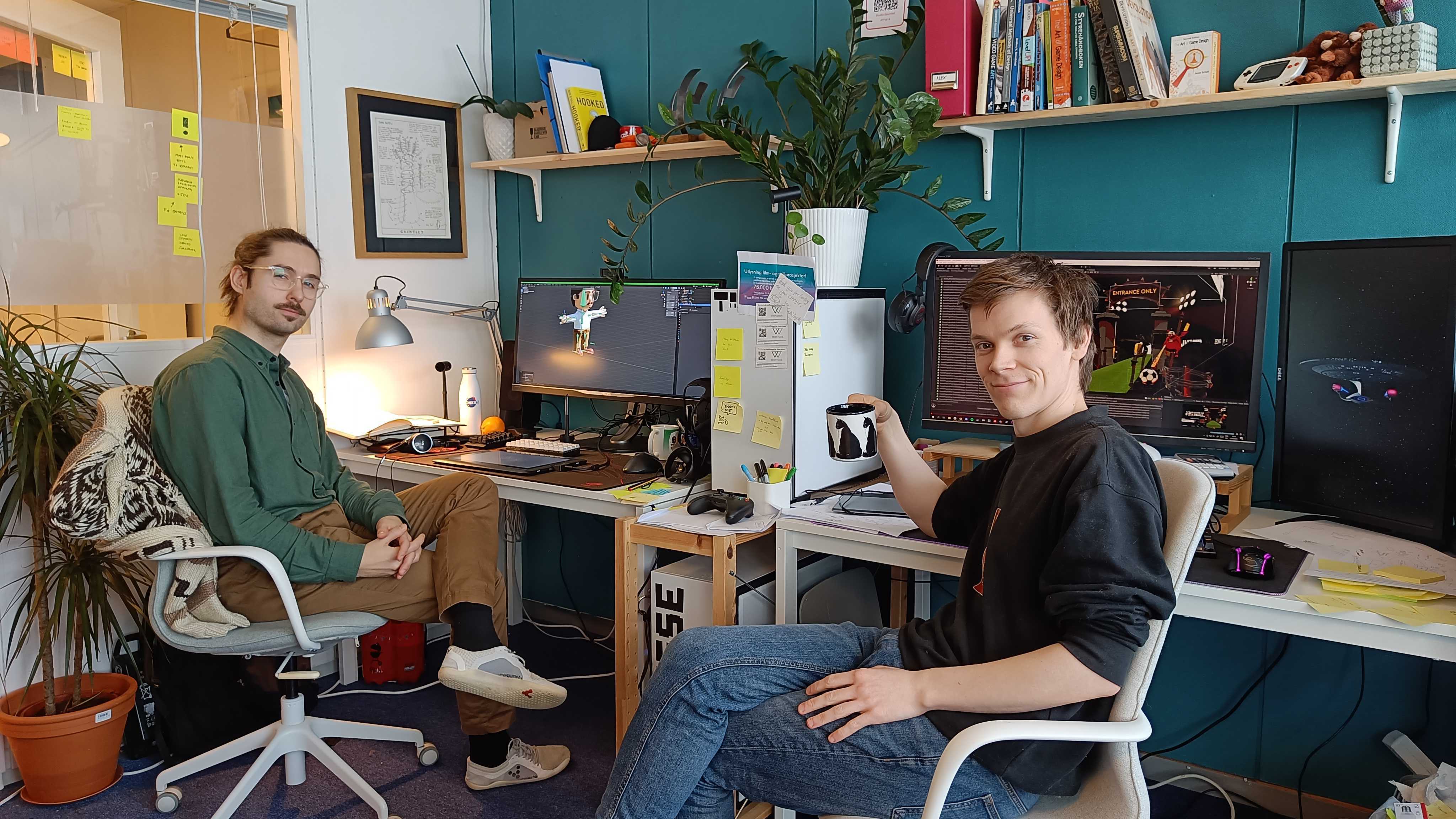 Image description: Christer (left) and Alex (right) sitting in front of their desks in the current Studio Gauntlet office. They are clearly working really hard, and really good.
