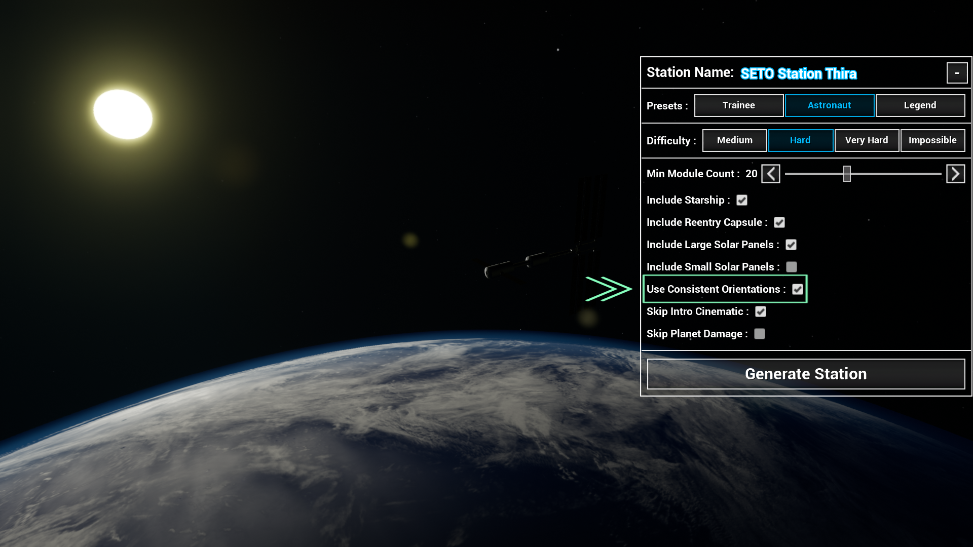 If this setting is checked, the procedural generation system will generate the station modules using consistent orientations. It will be enabled by default. This will make it easier for players to orient themselves inside the station but will somewhat limit the number of possible module combinations.
