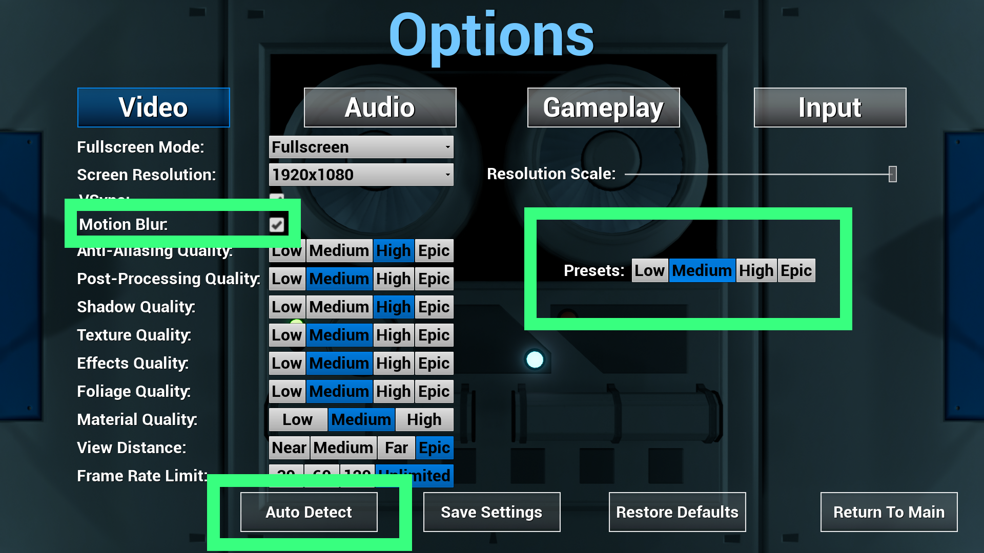 These should make it easier for people to get the game running at an optimal frame rate. Motion blur can also now be disabled but is recommended for any average FPS of 60 or less.