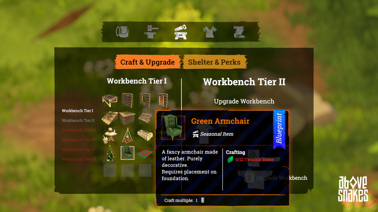 Make sure to go on adventures in Above Snakes until January 10th and collect Twinkle Stones (you can receive them at random by scavenging for resources). Collect enough Twinkle Stones to craft seasonal decorations! Note that these can no longer be crafted after the event ends! The crafted items will of course stay in your inventory. Dismantling the items with the hammer will retrieve the item as a whole.