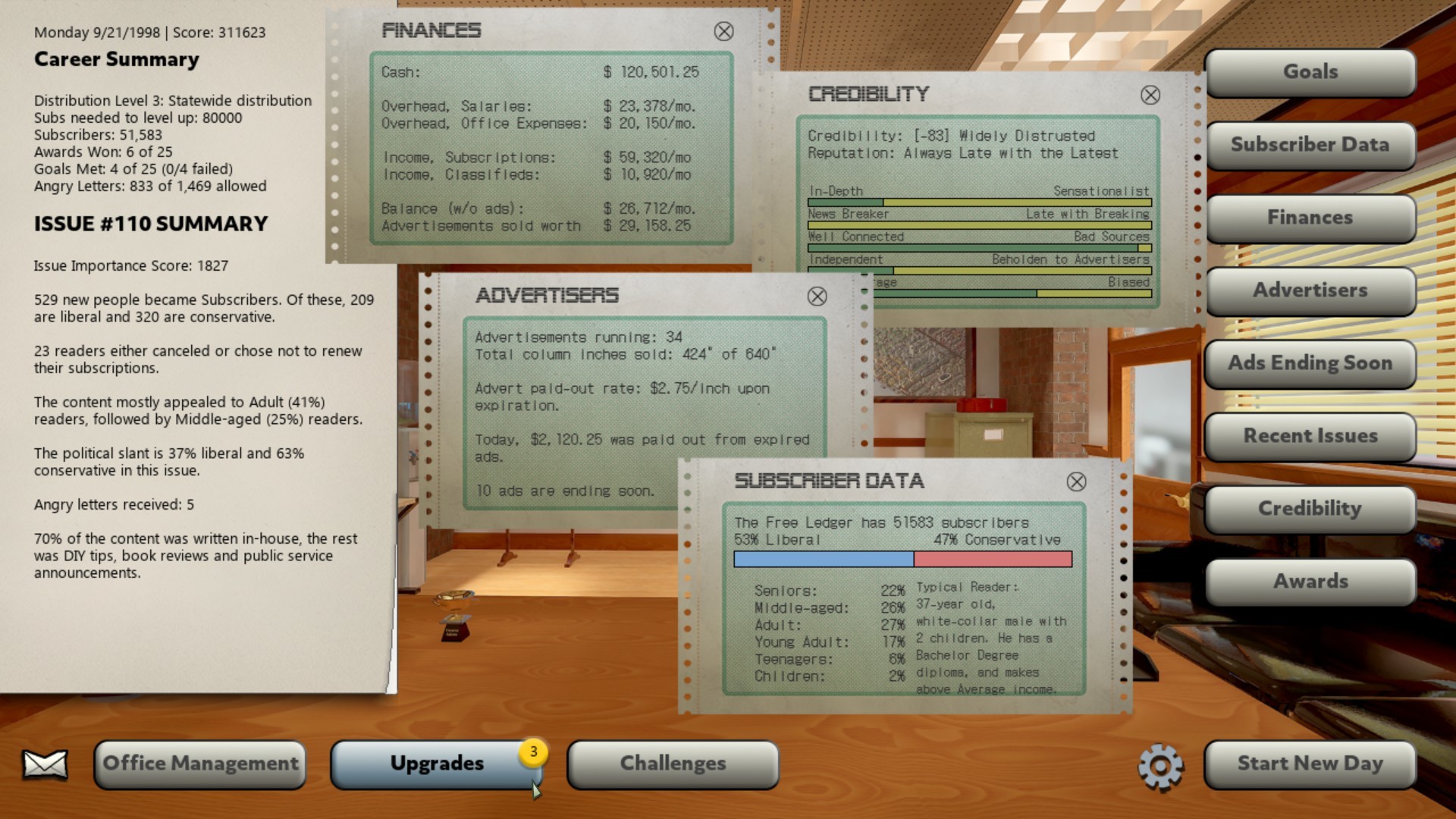 Tip: Storylines can unlock Awards, cash, or allow more Angry Letters. They trigger through upgrades, themed issues, and reputation, each playing out only once per game. Every storyline has 3 possible outcomes - the exact effect depending on your newspaper’s direction and your choices, so consider each one carefully.