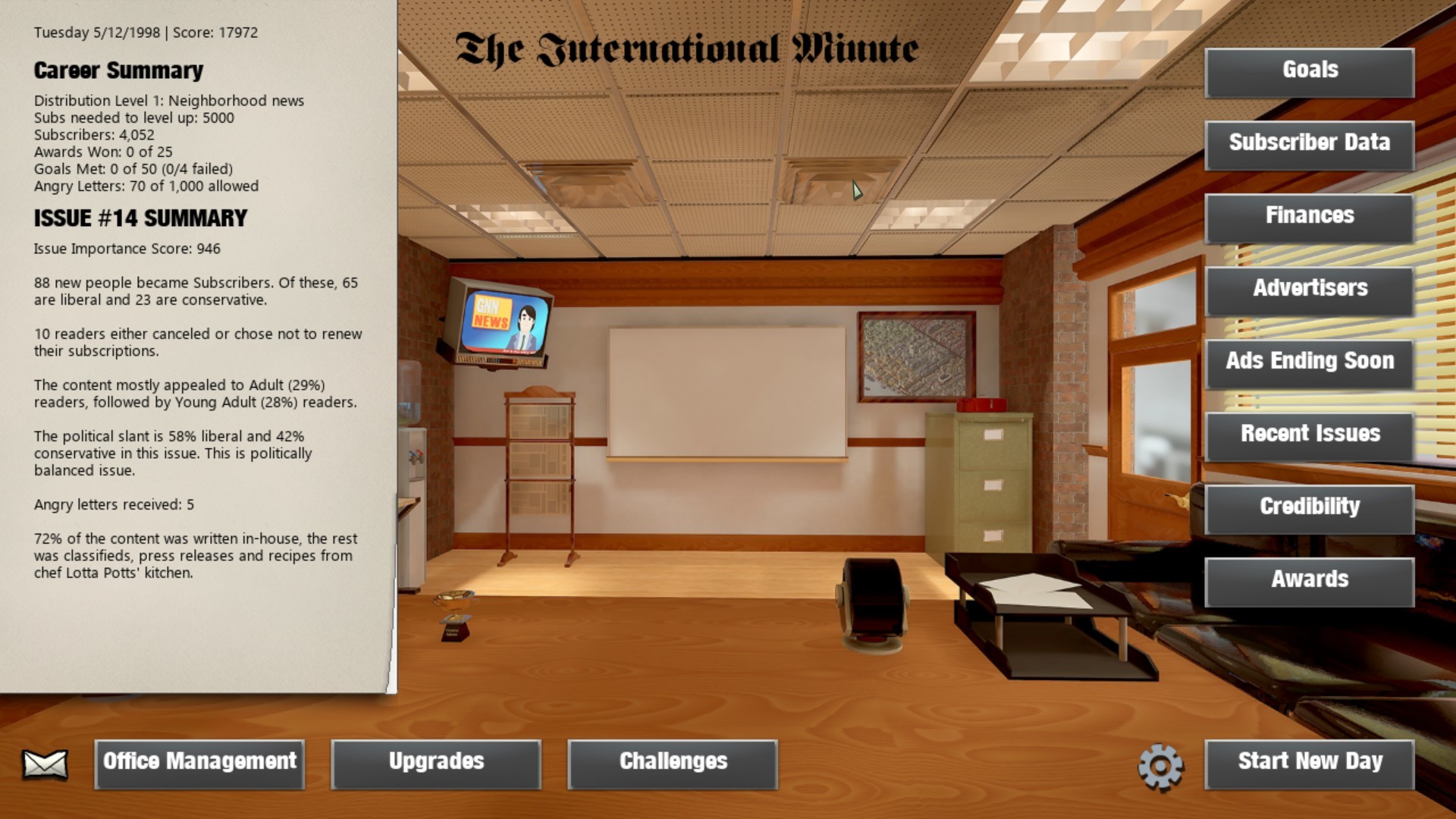 • Changed: More subscribers will either cancel or choose not to renew their subscriptions, scaling as you progress through the game and rival media grows stronger (TV and Internet news)