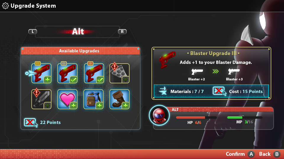 What can you do with your precious Upgrade Points? You can now purchase upgrades at any Checkpoint System to enhance your abilities. This can vary from a much needed permanent Health Upgrade to more base damage to your Sword and Blaster!