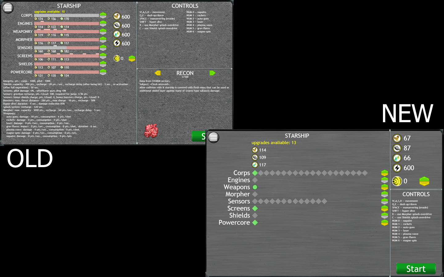 - added, a bunch of passive bonuses from certain levels of upgrades of Corps, Shields, Morpher, E-core (morpher overcharge, corps & pilot hp regen, burst-shot of auto-guns).