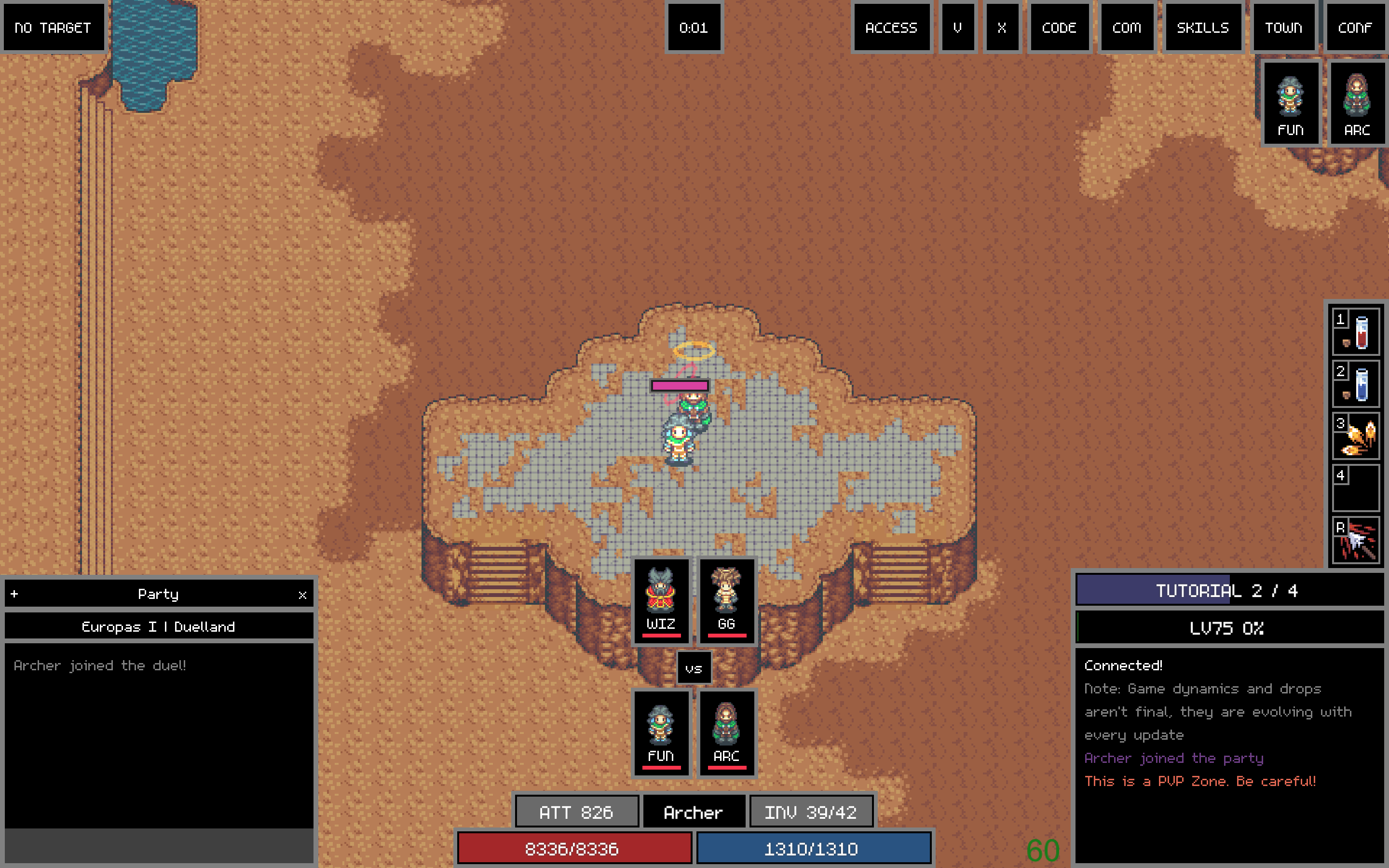 Technically, each duel is added to the server data, i.e. parent.S - If there's a duel in parent.S.duels - the transporter NPC lets anyone join and spectate the duel, during the duel, the instance data, i.e. parent.I is populated, parent.I.A includes the challenger party, I.B includes the acceptor party, each entity of the array is updated secondly with coordinates and other info like hp/character type (Going to document these soon)