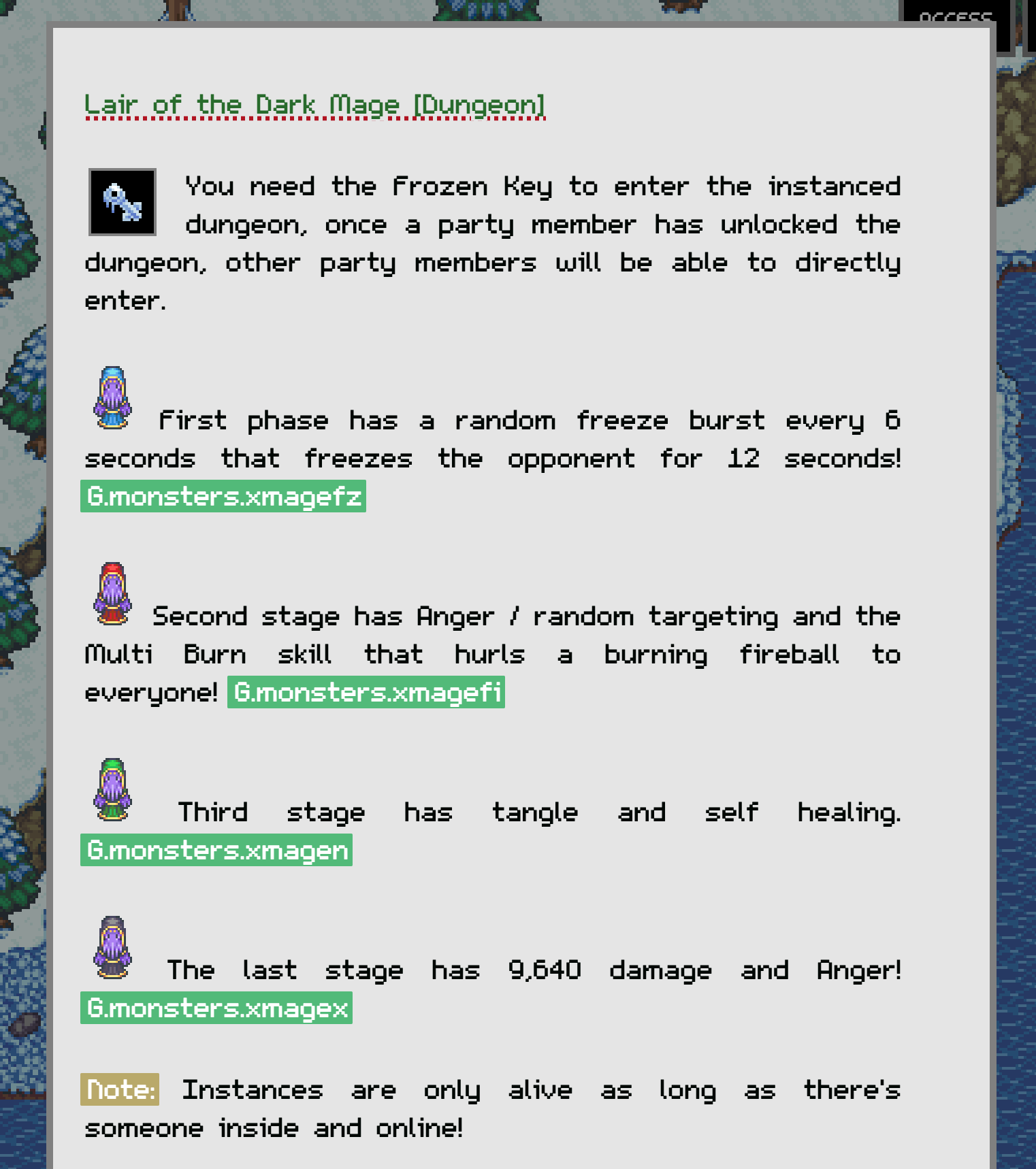 The bad news is, there will be a 20 day full lockdown here, starting Wednesday night, so I'll lose at least 2 days this week while preparing - best case scenario the update could happen closer to weekend, feel free to suggest new items and new dynamics, the Mage goes through a Ice / Fire / Nature / Darkness change, basically there are 4 variations, and after each one is defeated, the one after that spawns, there's a new "respawn_as" property in G.monsters