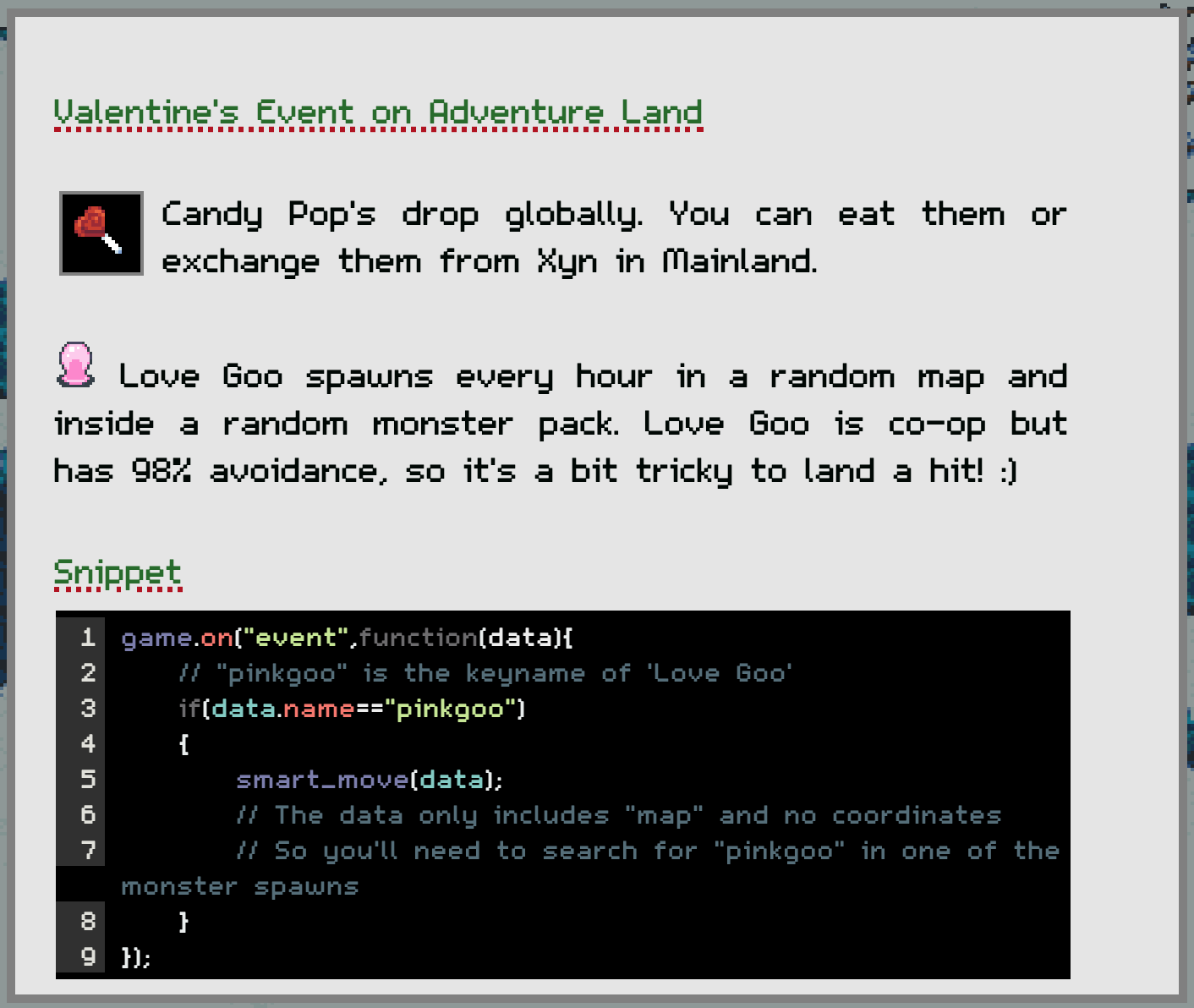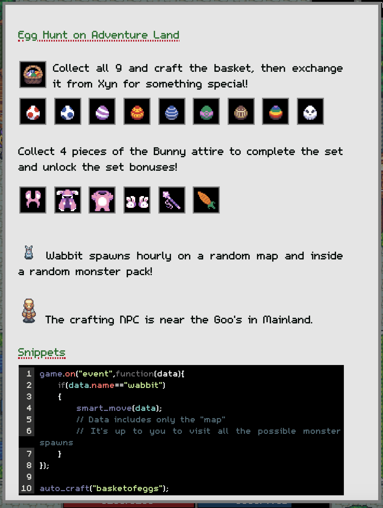 - New Code Functions: get_party, get_servers, get_characters, kick_party_member, consume - move, xmove, smart_move routines now return Promise's - New Method: stop('smart') - New Abilities: "regen_hp", "regen_mp" - Added new buttons / shortcuts to the Guide - New Discord message for game updates