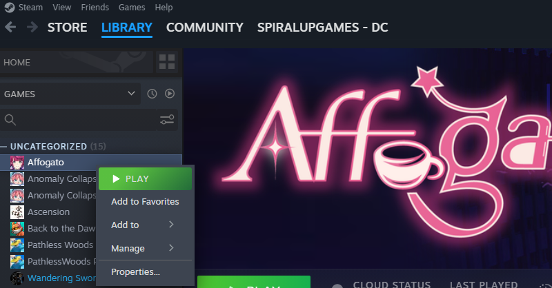 In your Steam library, right click on Affogato, then click on the "Properties" button on the pop up menu.