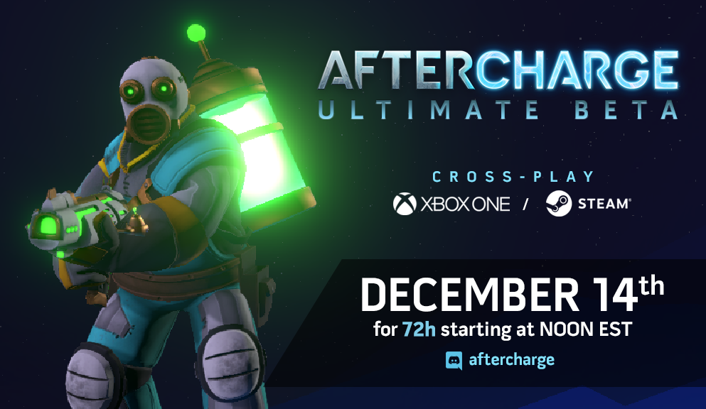 The Ultimate Beta Weekend starts next week. We will be opening Aftercharge for PC and Xbox One players on December 14th at NOON Eastern Standard Time and we will be closing down the servers 72 hours later, on December 17th at noon.