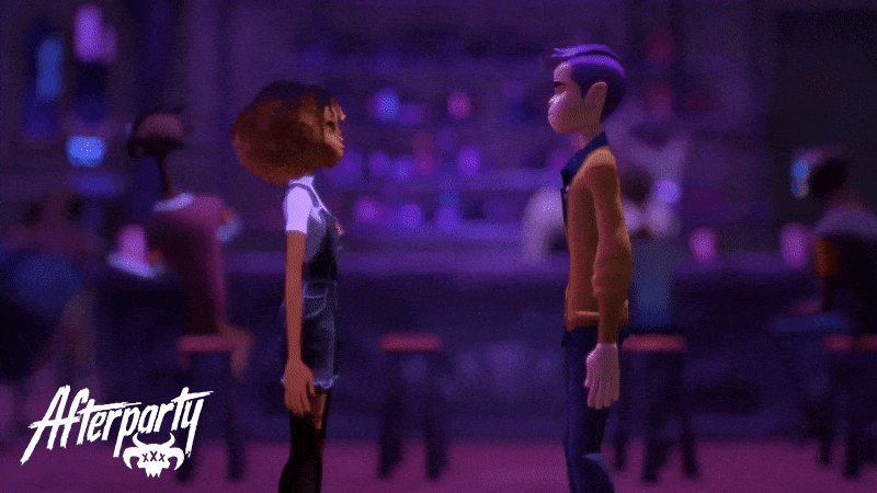 Whereas our last game, Oxenfree, had a unifying dilemma that the whole cast was trying to overcome, we wanted to make the situations in Afterparty reflect a much larger cast with their own unique problems. Milo and Lola just happen to stumble through these moments on their own journey, and the game is structured to feel more like a binge-worthy streaming TV series filled with an unpredictable cast.