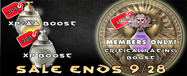 For the first time since the launch of the new Store, we’re running a sale on Boosters! From now until September 28th, get 30% off XP+AA Boost (4h), as well as the XP Boost (4h). Plus, Members get an exclusive 40% off the Critical Rating Boost (4h) during this sale!