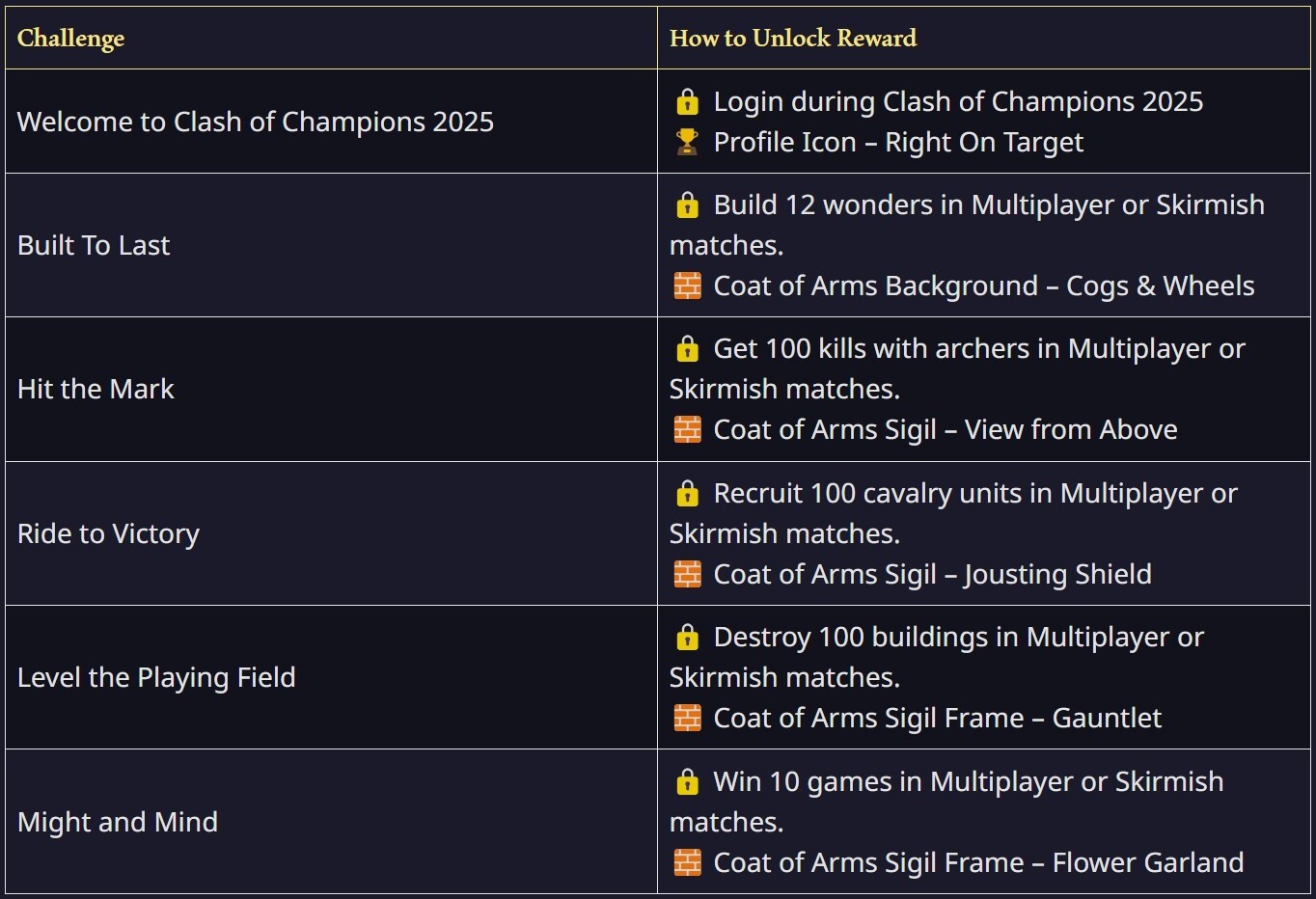 It’s time to flex your true strength! Clash of Champions is an opportunity to show your excellence in all forms, whether it be your skills in archery or jousting on horseback. Dominate the competition and display your rewards proudly.