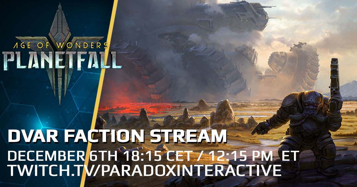Tune in to twitch.tv/paradoxinteractive at 18:15 CET / 12:15 PM ET today (December 6th) for a indepth look at some Dvar gameplay!
