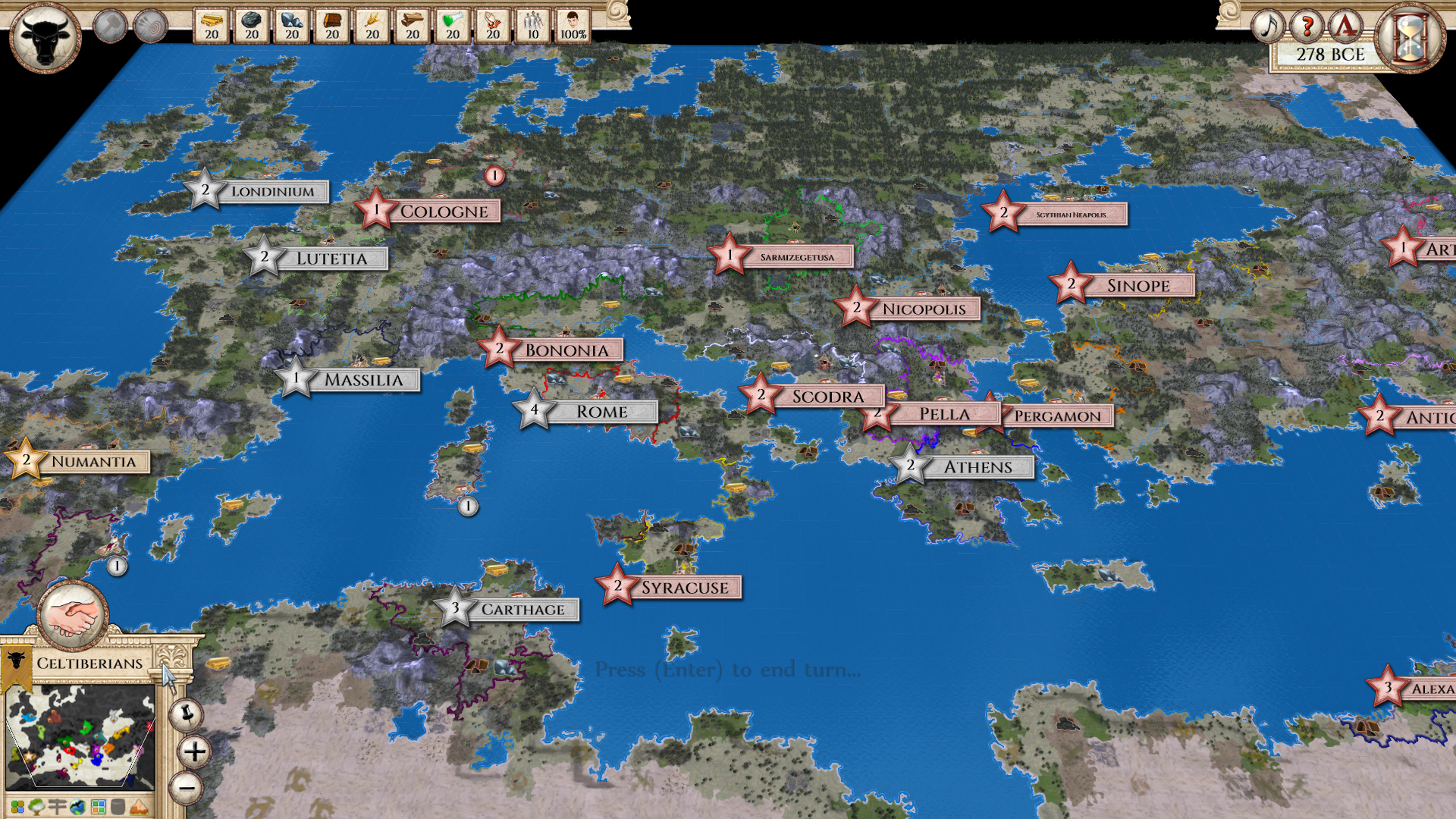 The last phase of preparing the scenario was the calibration. I wanted the scenario to well balanced. It was difficult to achieve because starting nations, by design, were not perfectly balanced. I wanted to see strong Rome, strong Carthage but weak Britons and Armenia. That’s why Rome starts with bigger capital and tons of resources nearby and Carthage starts with cities on two continents. So in order to ensure that the scenario will be highly replayable but with few historically strong civilizations to provide the challenge, I had to allow the AI to play it alone with no interference from my side. A few such games helped me to assess the game’s balance, and after few tweaks to starting positions of civilizations and resources locations I finally achieved satisfactory results.