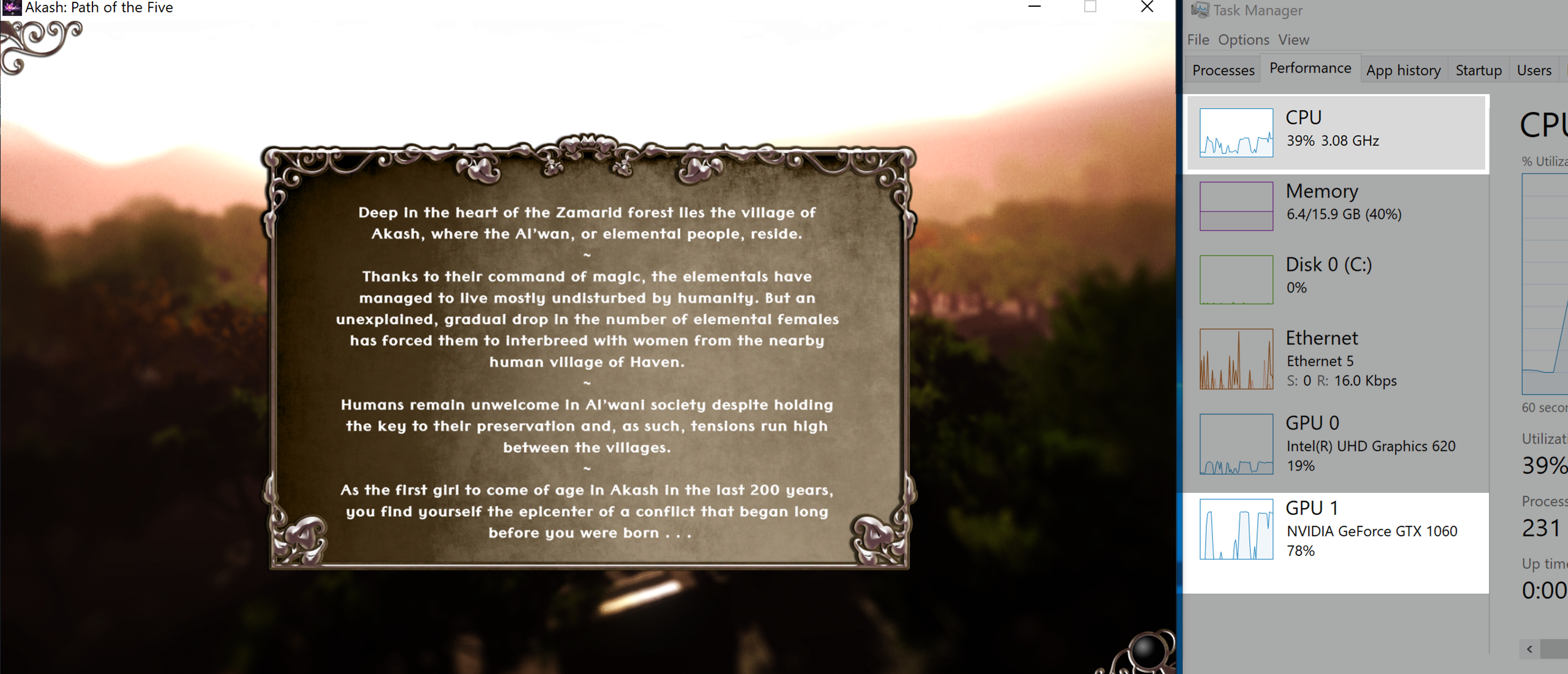 The following is an example of the game running on the highest available settings on a Surface Book 2 with both an integrated GPU and a mobile 1060 processor, set to an internal resolution of 1080p. Average frame rate is a v-synced 60 fps. GPU utilization remains fairly consistent across different scenes, dipping lower during indoor and peaking during outdoor areas. GPU load peaks at during outdoor scenes at 79% on this system (which, fun fact, has over 100 hours of play and editing time accumulated for Akash alone), and this is while running other processes (including capture and image editing tools) which add additional GPU overhead: