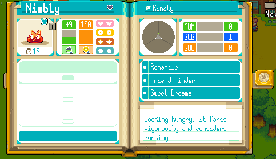 Every Jelly can have up to 3 traits. Traits can effect things such as digestion speed, stats, breeding and behavior. However, we’ve added some special traits (also known as Abilities) that activate while the player is carrying or holding a Jelly. These include finding hidden items, seeing when wild Jellies will appear and more!