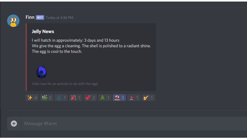 Finn will post updates on the egg every few hours with a guess of when he think it will hatch. We can vote on doing an activity with the egg by clicking on the reactions.