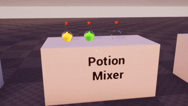 Regarding the mixture mechanics, I think that would be cool adding the capability of grab potions through physics and mix them flipping the bottles. This feature turns the mixture into a minigame because you can fail the position of the bottle and make a mess with the liquid so it would be very fun!