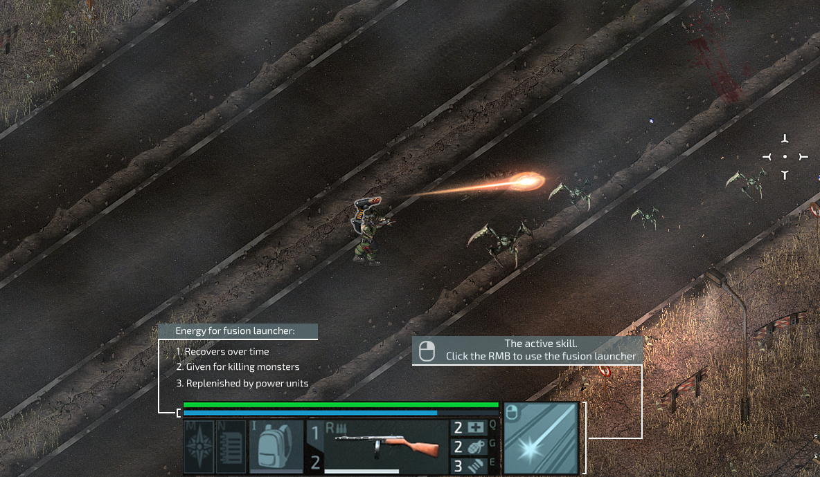 In attack mode the gun can be activated by clicking the right mouse button. Clamp it at the moment, while firing at the enemy from the usual hand weapons, and enjoy the spectacle of the enemy roaring in pain.