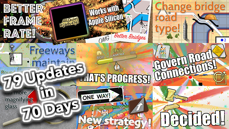A lot of good things have happened with All Quiet Roads 4743! In the past 70 days there have been 79 updates to the game. Some of the changes have been major!