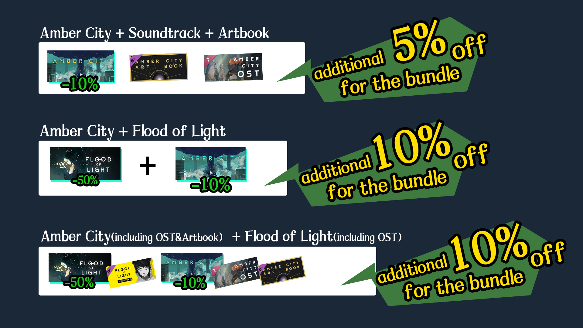We offered 4 bundles this time. Unfortunately, we found that Steam store page can only show a maximum of three bundles. You can find another bundle by searching keyword "Amber City".