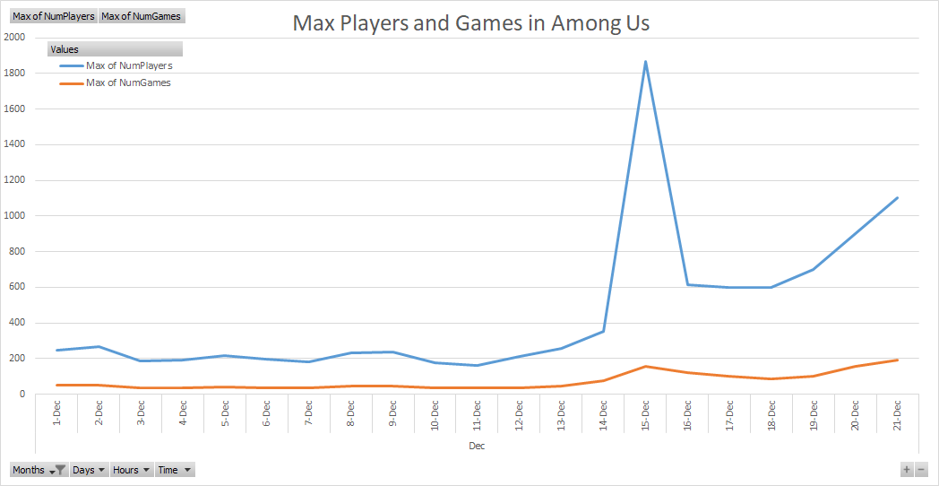 So Here We Are From the graph above, you can see that we're reaching 1200 concurrent players sometimes now. And that is capped by Among Us Server so we don't go above 80% CPU. The server is actively turning players away at peak hours.