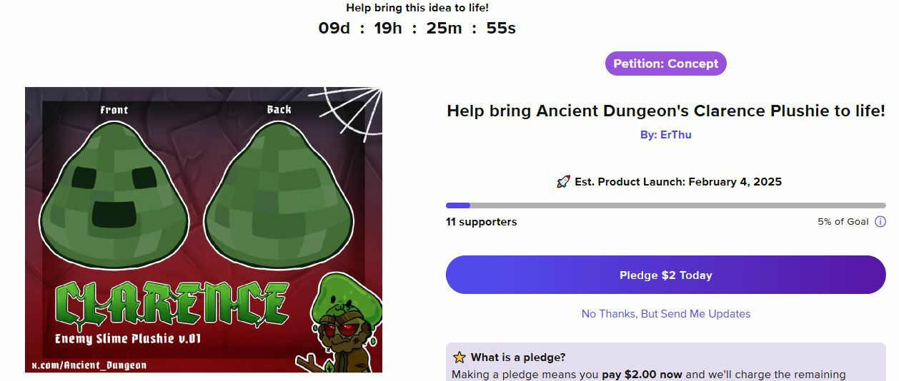 Your $2 pledge helps ensure that Clarence goes from dungeon-dwelling slime to a plushie you can proudly display on your shelf (or snuggle with during intense dungeon runs). 💚
