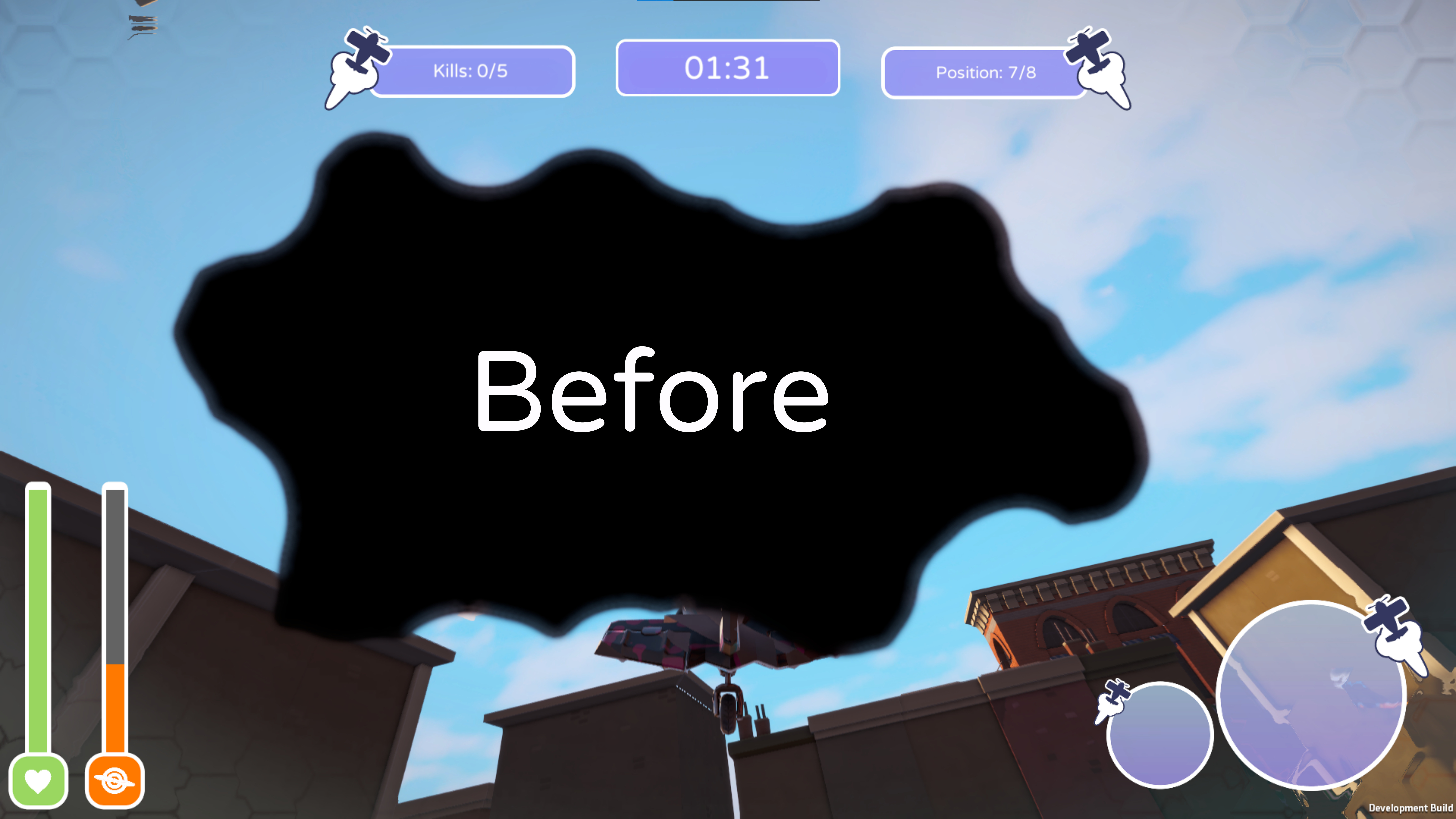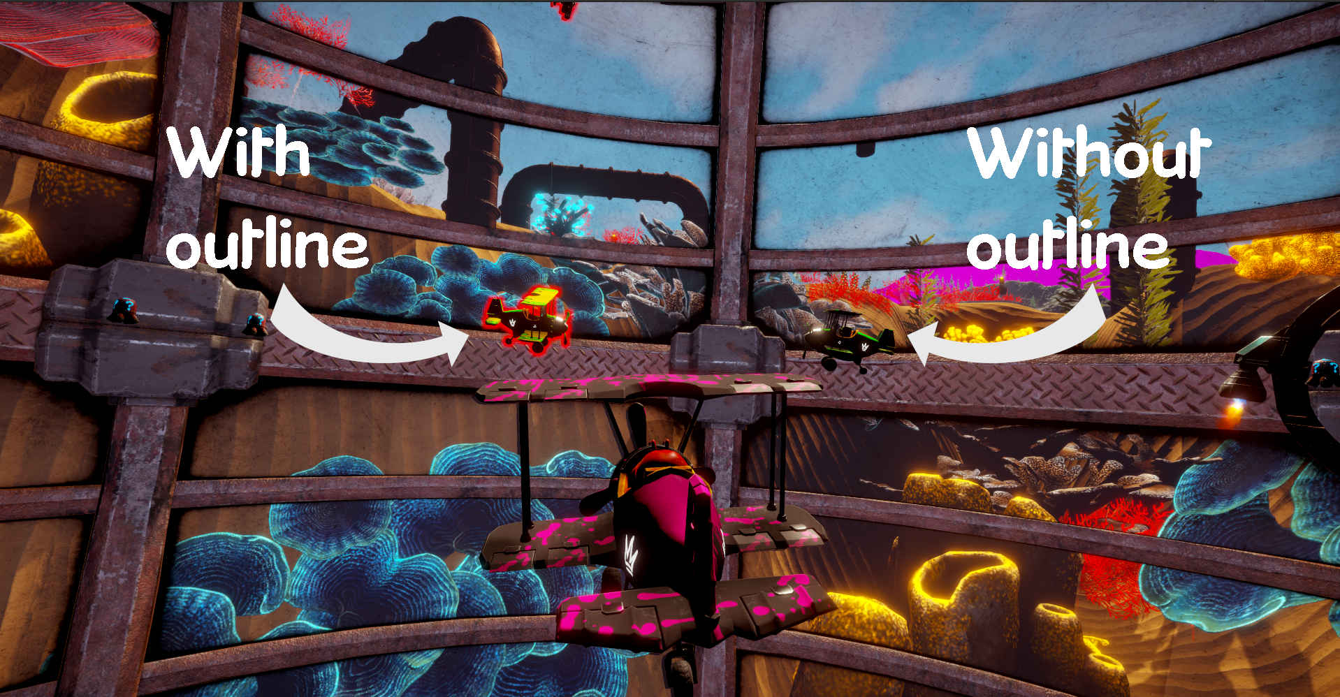 Outline To make the game more pleasant for you guys, we’ve added a red outline to our planes, so they are more visible! This outline was added to the Demolition and the Capture The Flag mode. In the Demolition mode you can see the outline on every plane that is far away from you. In the Capture The Flag mode you only see the outline on the plane that actually holds the flag, so it makes it more obvious and you don’t waste your time by flying around and looking for other planes. Personally we think it helps a lot!