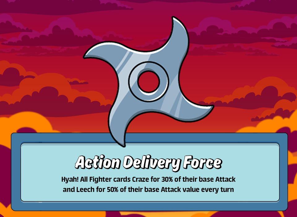 Action Delivery Force Fighter cards Craze for 30% of their base Attack and Leech for 50% of their base Attack value every turn.