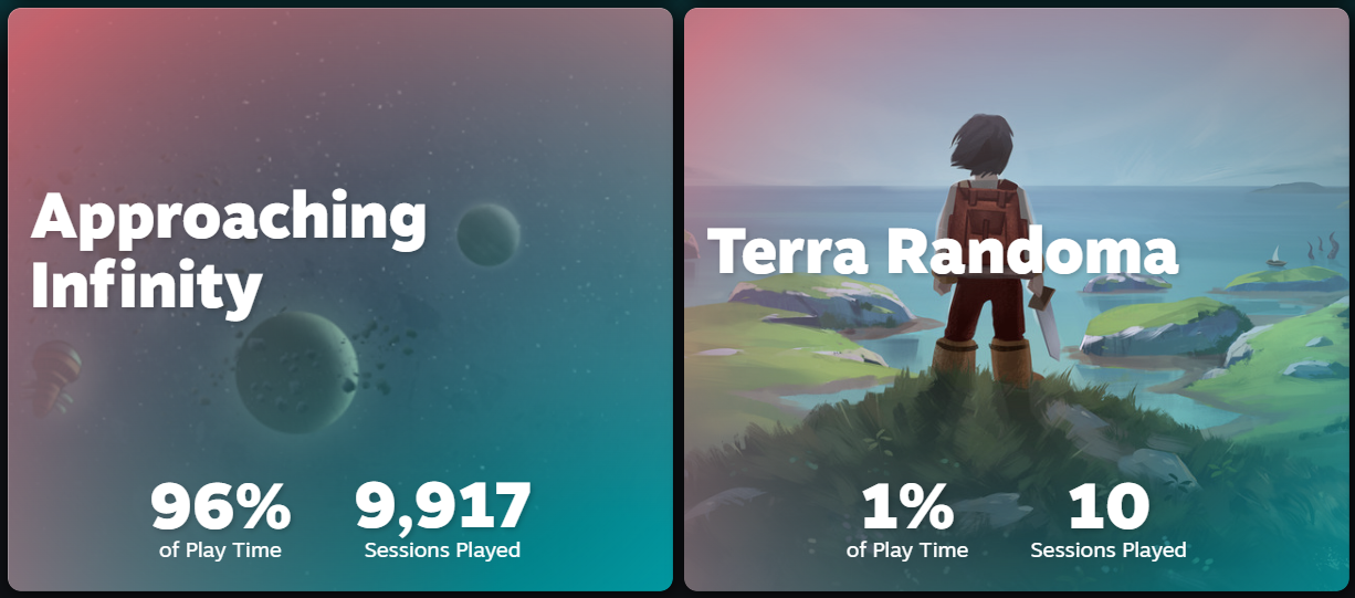 Approaching Infinity is 1 half of the new "Cosmic & Arcane: Epic Roguelikes bundle", along with Terra Randoma, a game I've been following for a long time, and in fact my second-most-played game this year, slightly behind a certain other game... It's quite a different game from mine, but with a lot of the same aesthetics and attributes.,, Not to mention the 6 years of continuous development. So if you've been curious about it, now's the time.