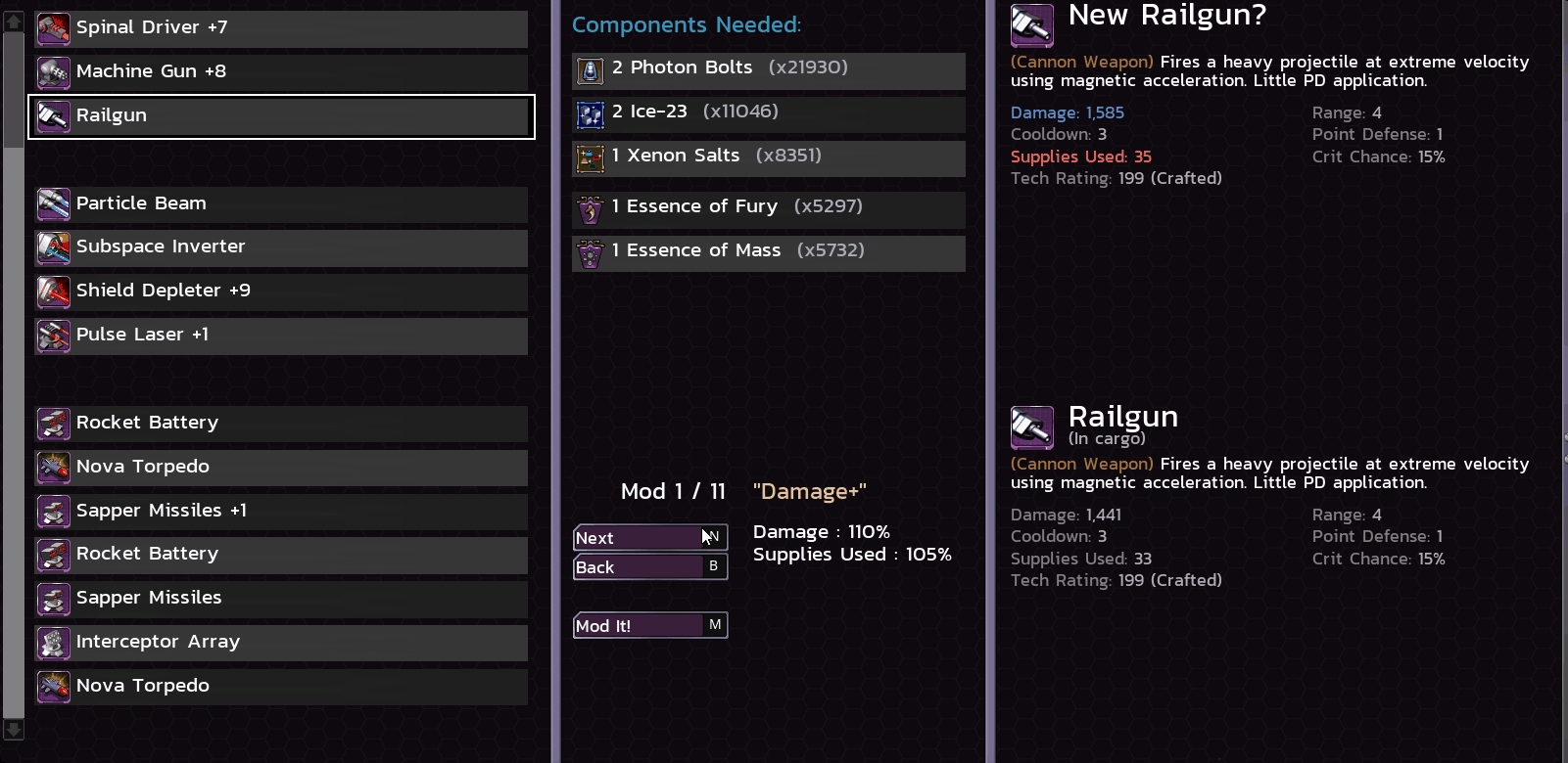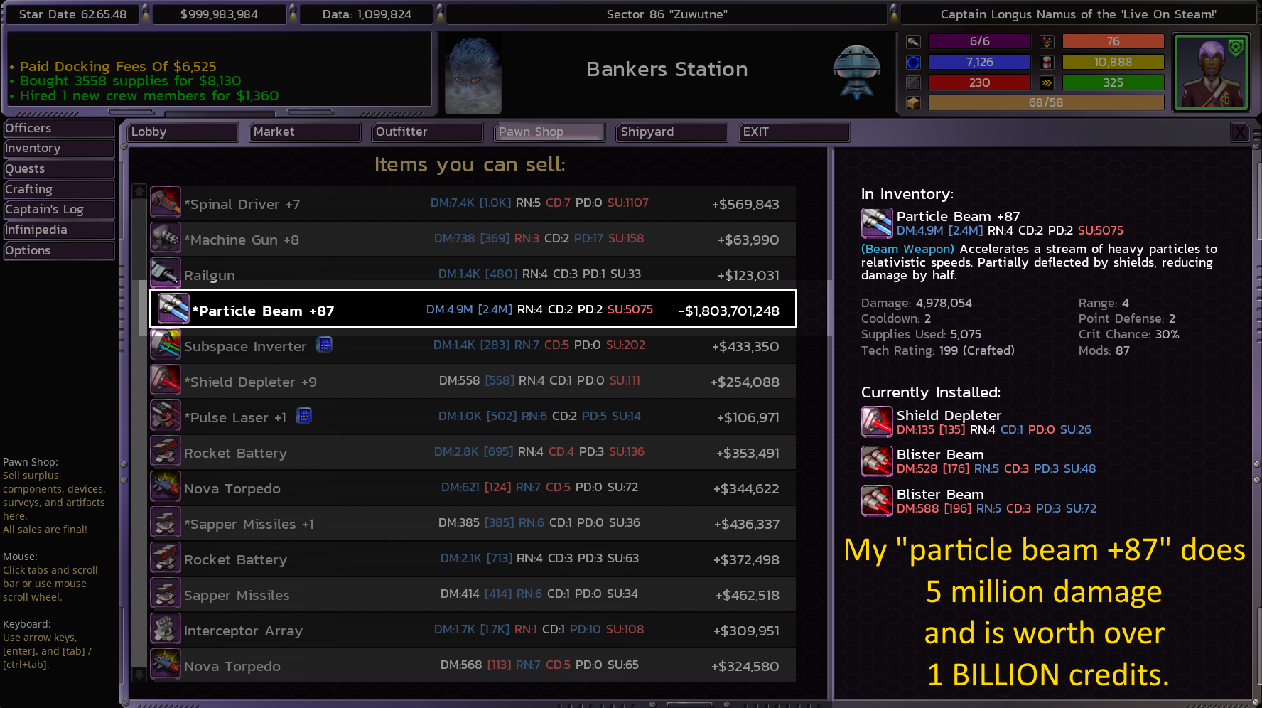 (My Particle Beam +87 does 5 million damage and is worth 1.8 BILLION credits!)