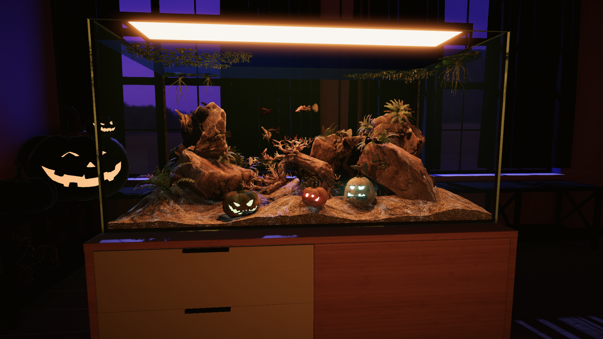 Halloween is getting closer! Therefore, we have a special Halloween update for you! You'll find a new Halloween theme for your free-play interior and 3 decorative spooky pumpkins to light up your tanks!