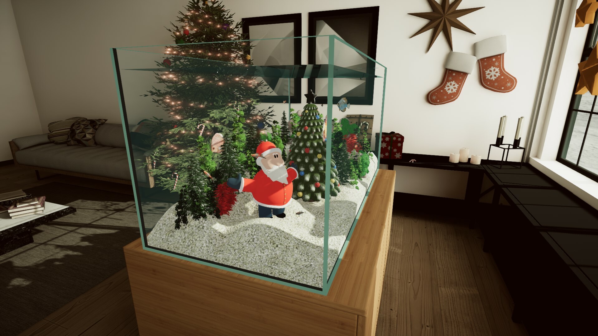 Christmas mode may not be present in the Sea Life DLC but you can still show your marine fish how snow looks. Use the bright substrates and create a little winter wonderland in the tank. If you don't have your copy of the DLC yet, you can always join the saltwater community and enjoy lots of new content :) https://store.steampowered.com/app/1939750/Aquarium_Designer__Sea_Life/