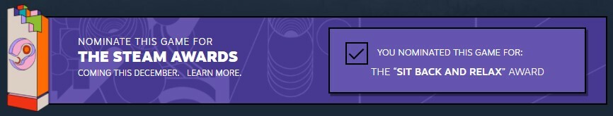 Anyway, Steam Awards 2021 are on and you can nominate your favorite game of the year. We're participating in the run for the Sit Back and Relax Award (the last one on the list). It would be great if you could nominate us for it as well!