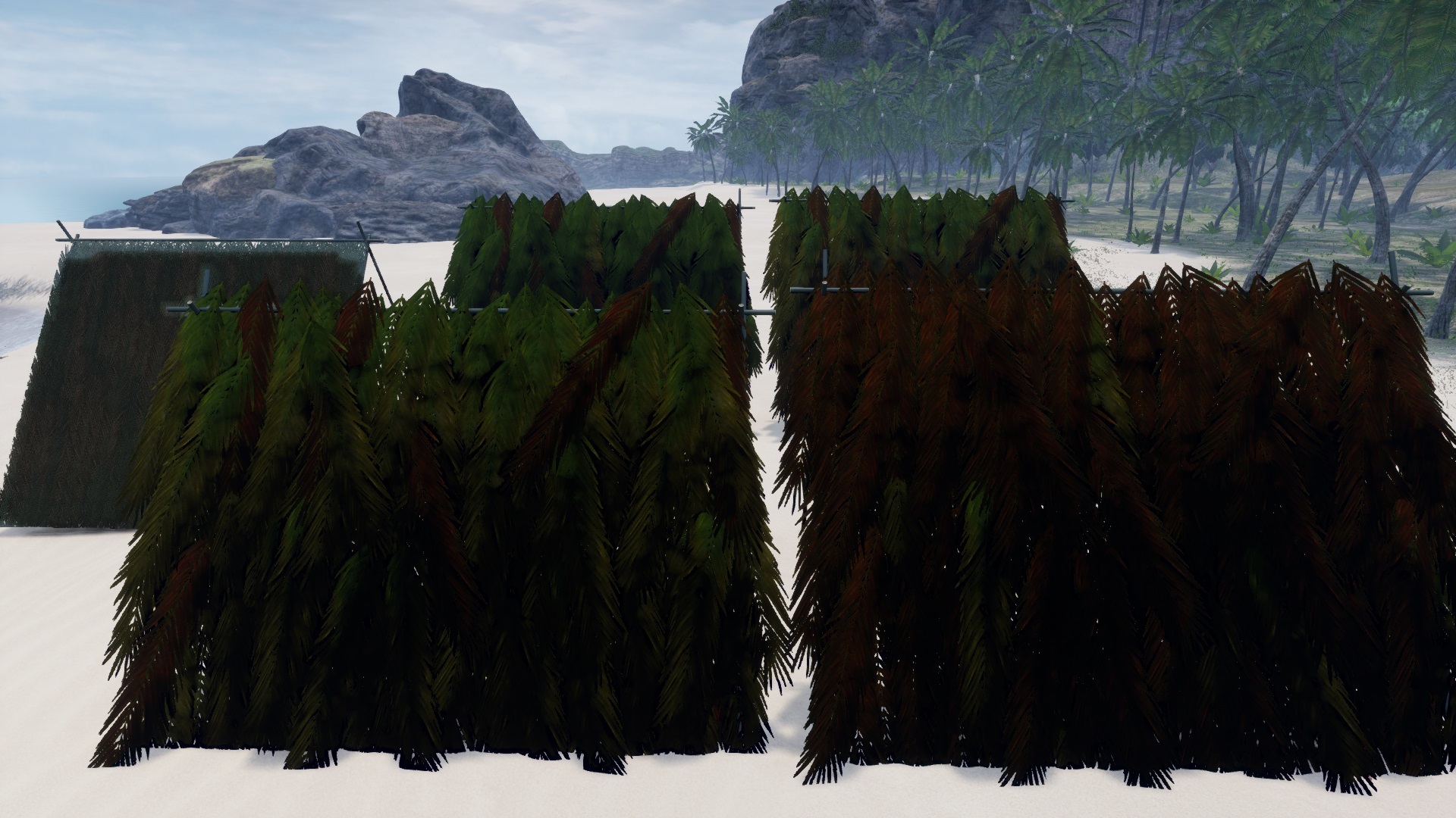 As my lead artist has now school holiday - we decided to upgrade the shelter to more realistic one. You can see it supports a variety of palm leafs from fresh to completely dry. The previous prototype shelter is on left to compare.