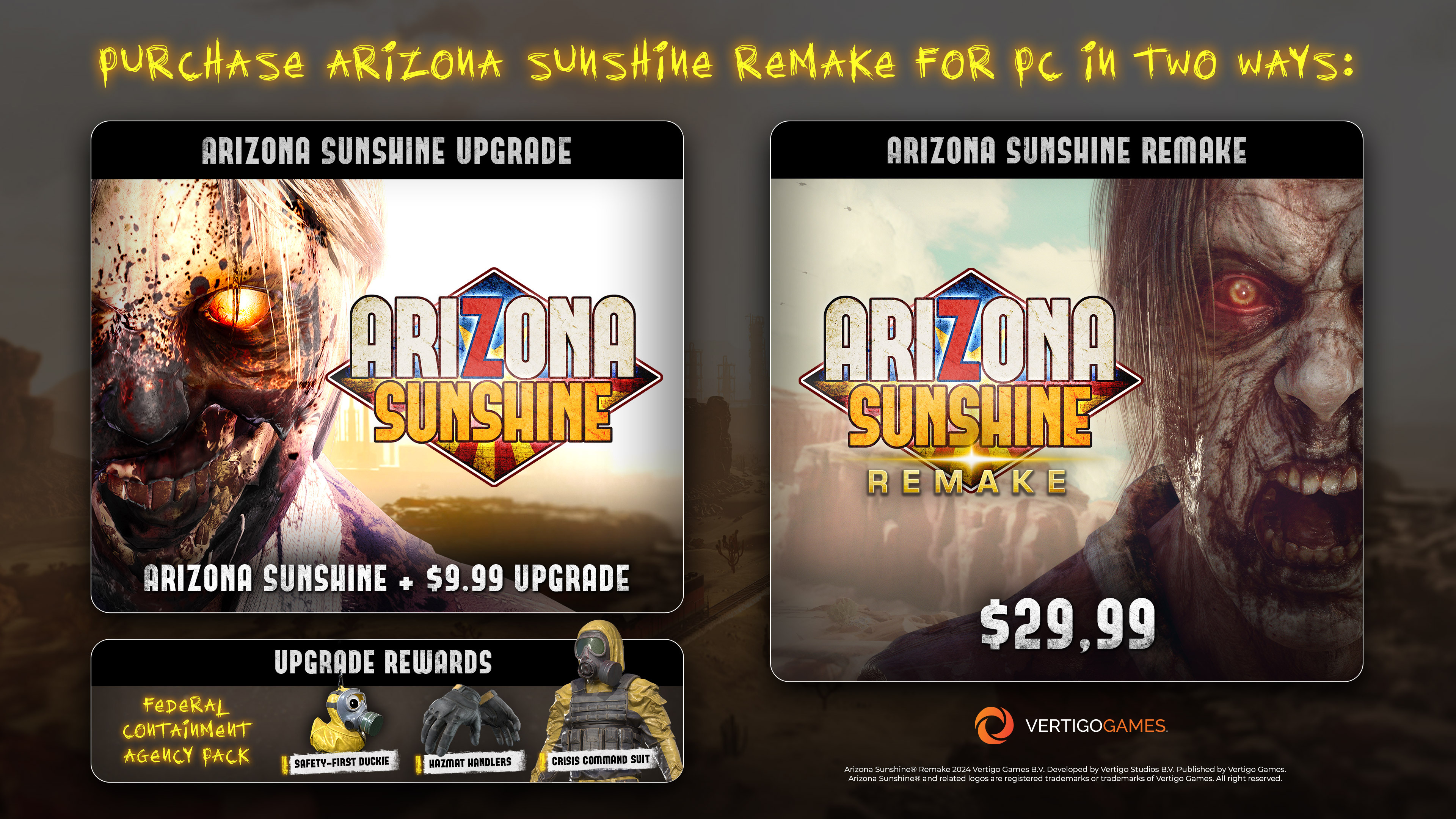 Pre-order Arizona Sunshine® Remake here and get a 10% discount plus the Federal Containment Agency pack, including: Crisis Command Suit, Hazard Handlers and Safety-first Ducky Charm.
