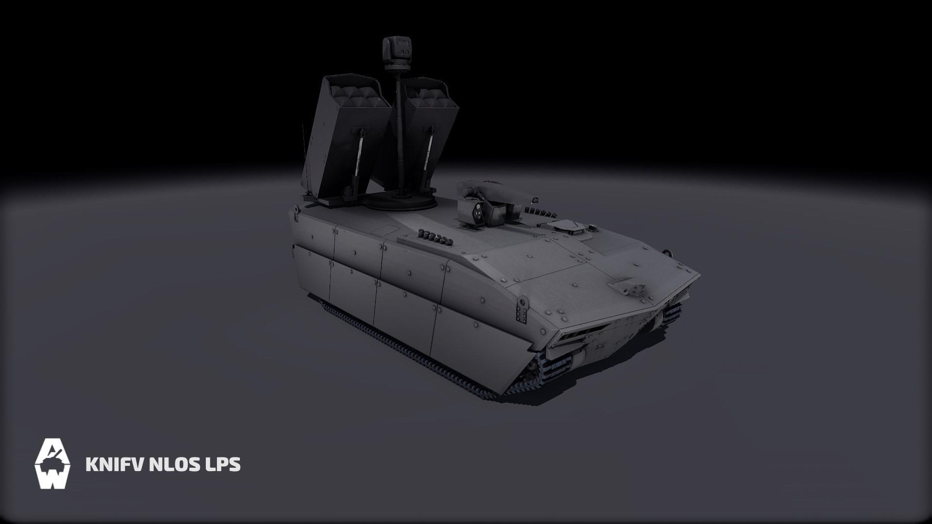 First, the KNIFV NLOS LPS. Based on our testing, this vehicle required only minor changes compared to the first version. One thing we did, however, is adjust the missile lock time (reduced for single launches from 3.5s to 3s between missiles) and trajectory to become more practical. The vehicle also had a long spotting range, which we reduced to 390m. Overall, despite its somewhat wacky look, the vehicle is highly viable.