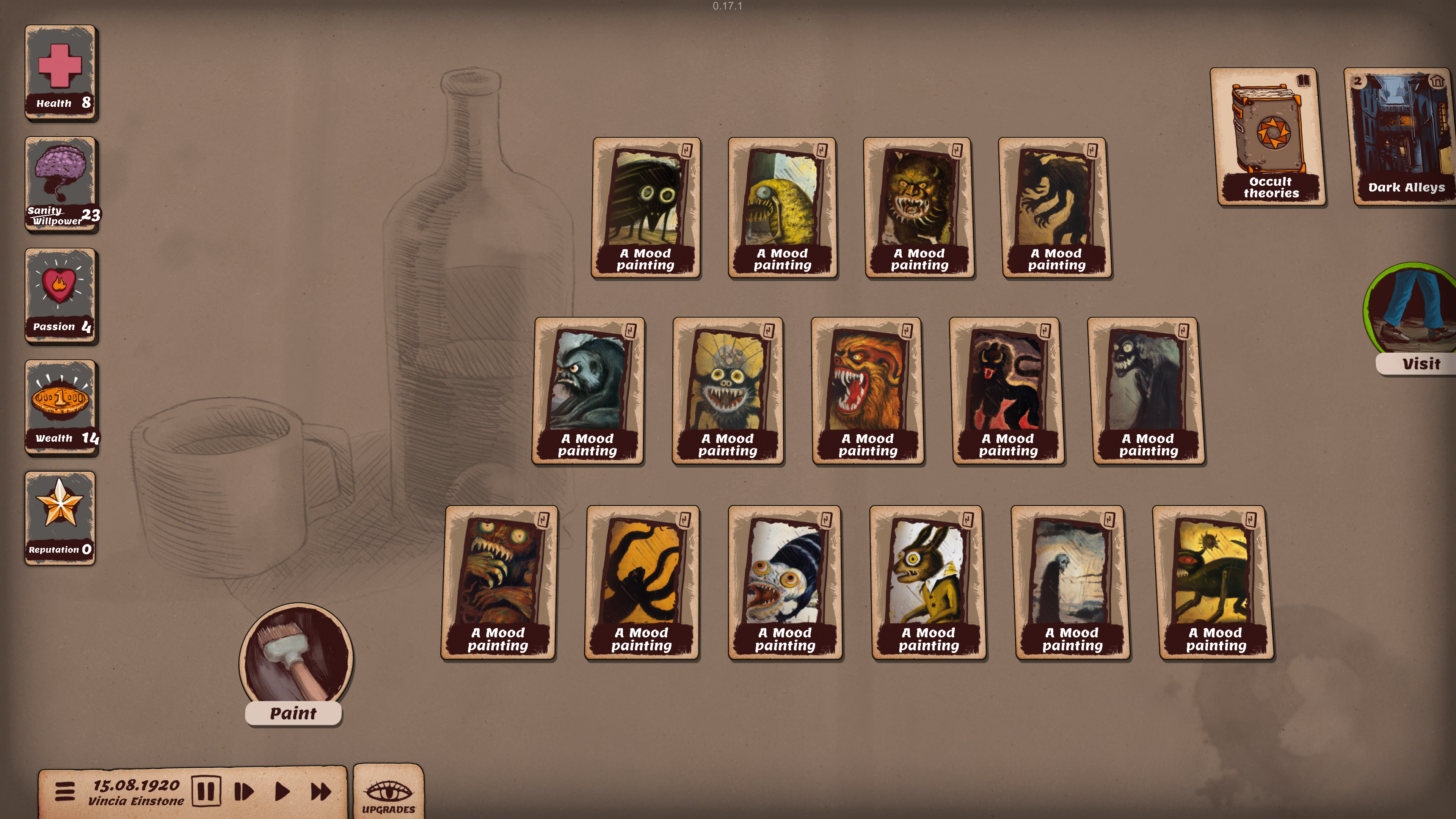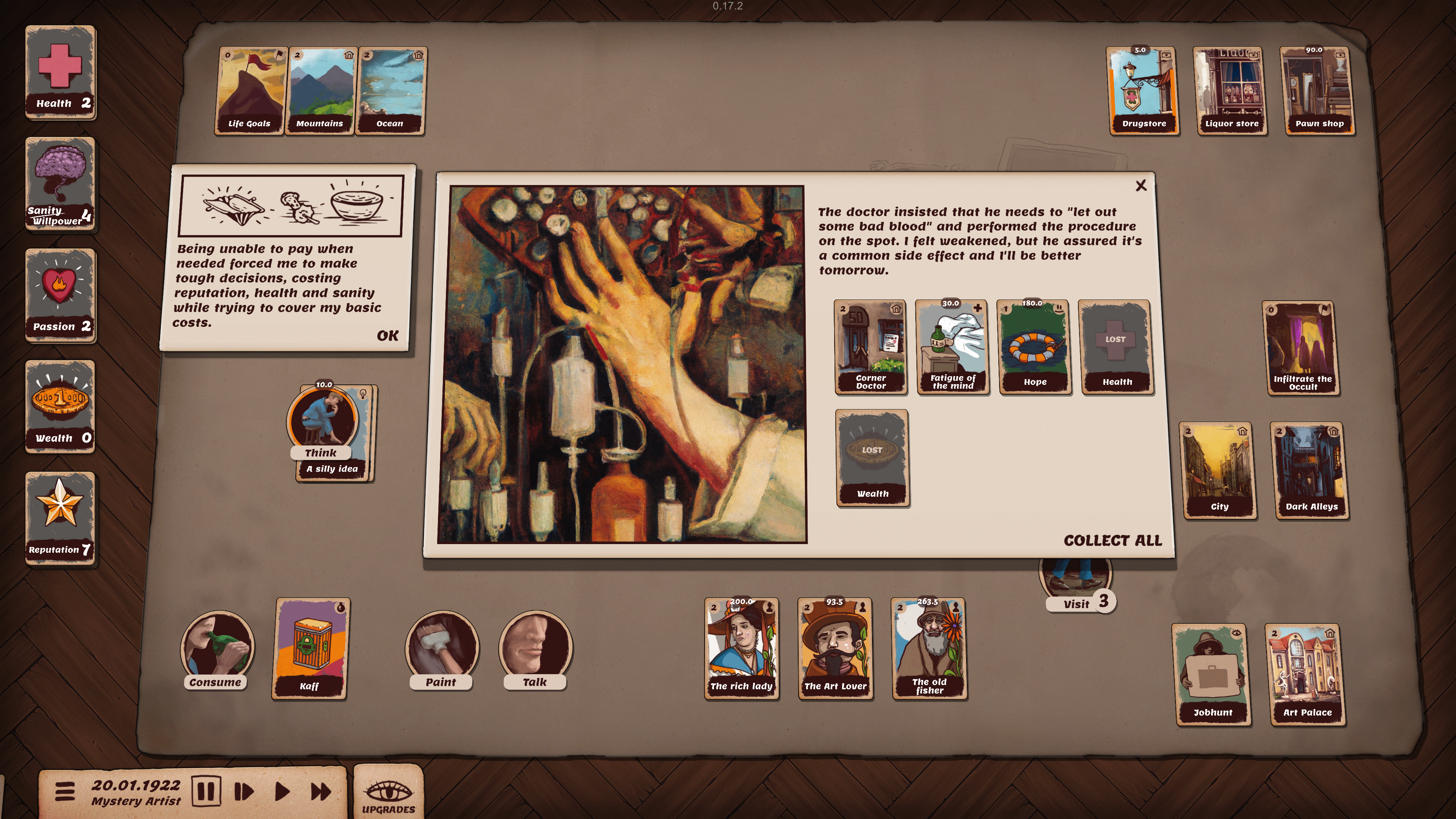 The new, redesigned upgrade tree introduces unique upgrades for each playable artist, diversifying them a little further. Completing any upgrade unlocks all upgrades of the next tier. Another feature we’ve wanted to add for a long time (and now did) is the ability to “resurrect” forgotten feelings from memories, by thinking about them with passion. You can now also send cards to action slots simply by cliking on a suitable card while the action window is open - it's very handy, thank you to everybody who asked for it.