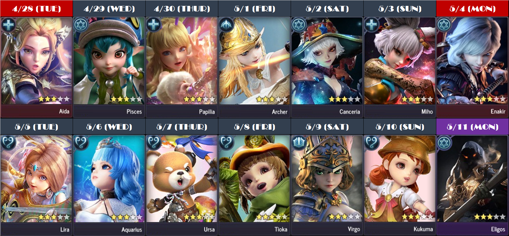 After maintenance is completed on April 28th, 2020, we will be giving out a free 3-Star Astel every day for the next 2 weeks! Check out the calendar below to see which Astel you can win on each day.