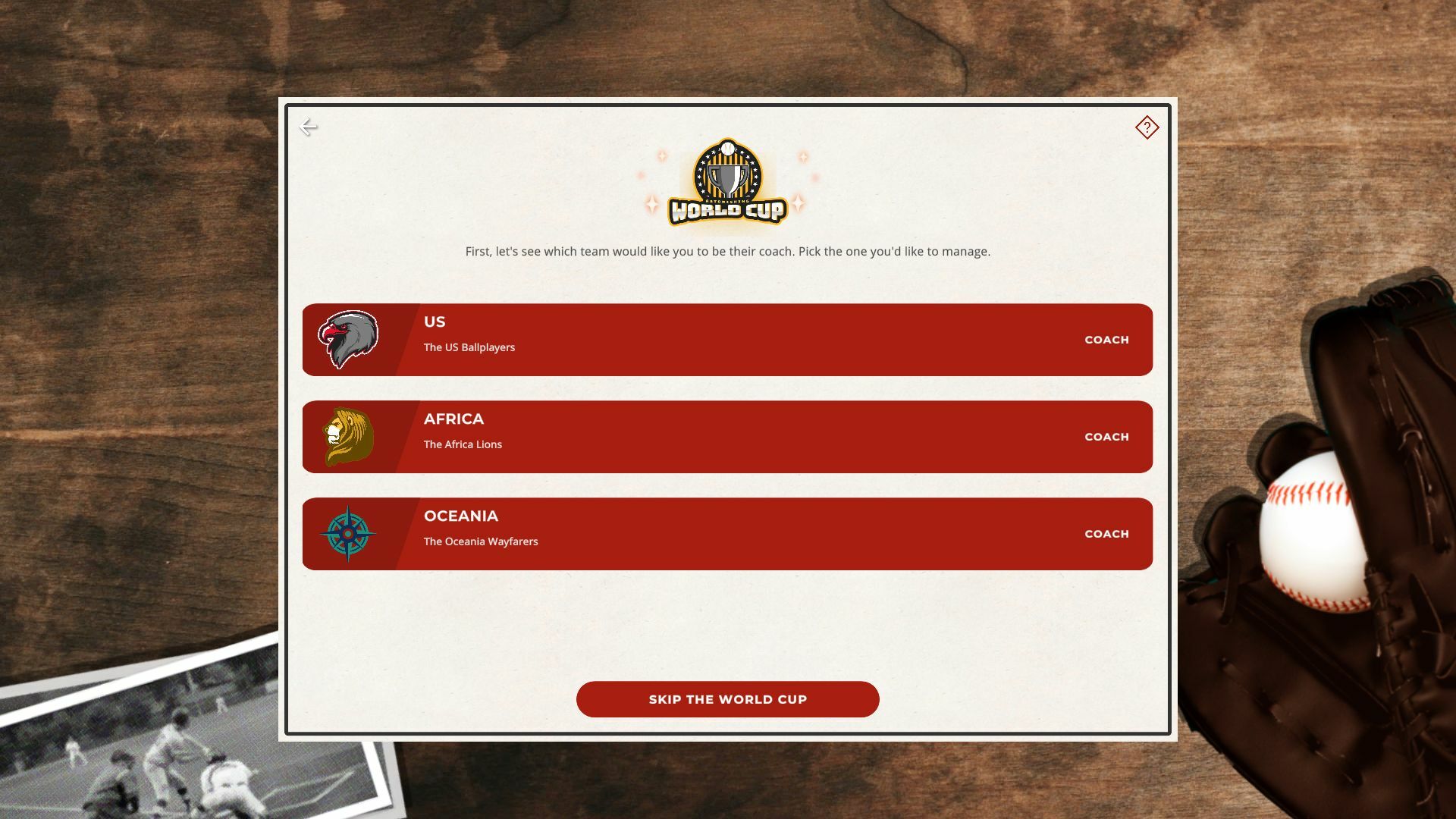 This week's update is a great one! Two big features have been added, and bunch of smaller ones are also joining the party! The first new feature is the "World Cup". This mini-event takes place every 4 years, during Spring Training. You will be asked if you want to take charge of an international baseball team, and lead them to victory! This is a nice break from the regular season. It's also a great feeling to play with stars from the entire league!