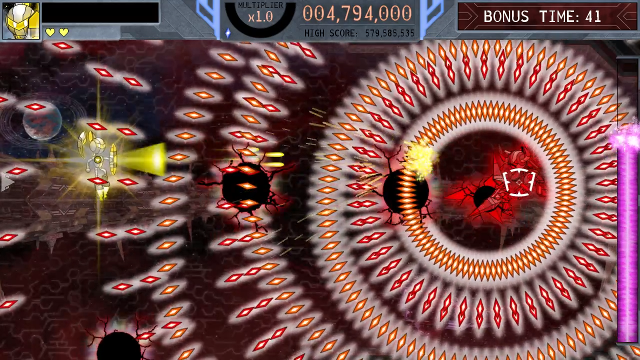 The overall theme of Hyperspace is that it now utilizes any progression elements achieved within a run. Each shadow fight won creates a new bullet-generating portal in the stage. Assisting NPCs will reappear on this stage to help the player. The bonus waves from timeskips will play out where they left off. Shoot as many UFOs as you can to spawn bigger and bigger ones. And Golden Starshooter is back with a vengeance!