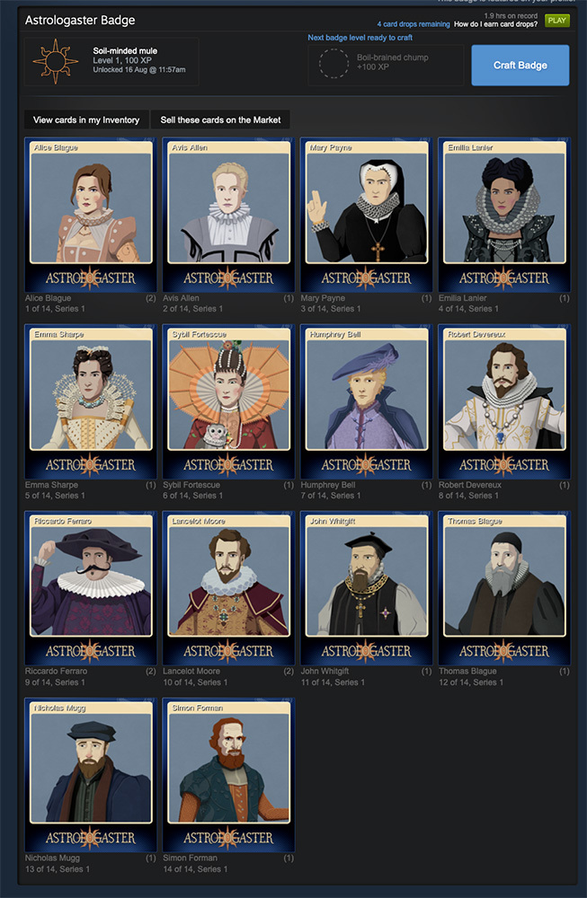 We added Trading Cards to Astrologaster. There are 14 cards in total, one for each character in the game. You can also craft badges, unlock 4 profile backgrounds and get the following 6 emoticons: :ablague: :astrologaster: :emilia: :forman: :lancelot: :nanahead: