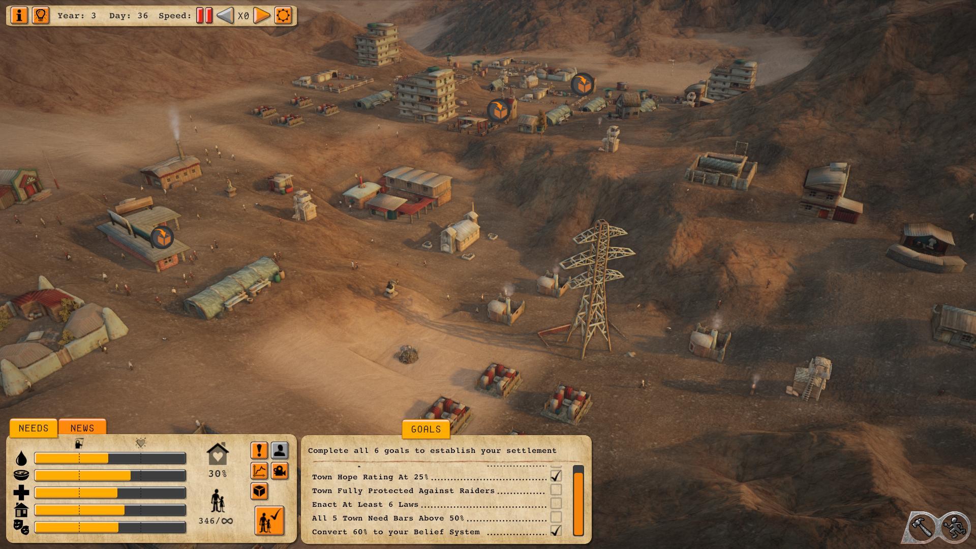 I guess the "story" of Atomic Society is about creating a little township and society that could be the seed of a new nation. Each update we make should increase the time it takes to get that little township going and make it a more epic journey. However, we understand there's still a lot of content missing, and some players just want to keep building and growing their town forever, so this week Adam has been working on making migration to your town essentially infinite. In the next update you'll be able to keep growing and build a town of 1000s if that's what you want. There will still be a "story" goal to get about 350 people and build that small settlement (and we'll expand the things you need to do to get there), but after that you can keep growing. Be warned though the game is not optimised yet and it is going to take a beefy PC to build a huge town with all those people in it!