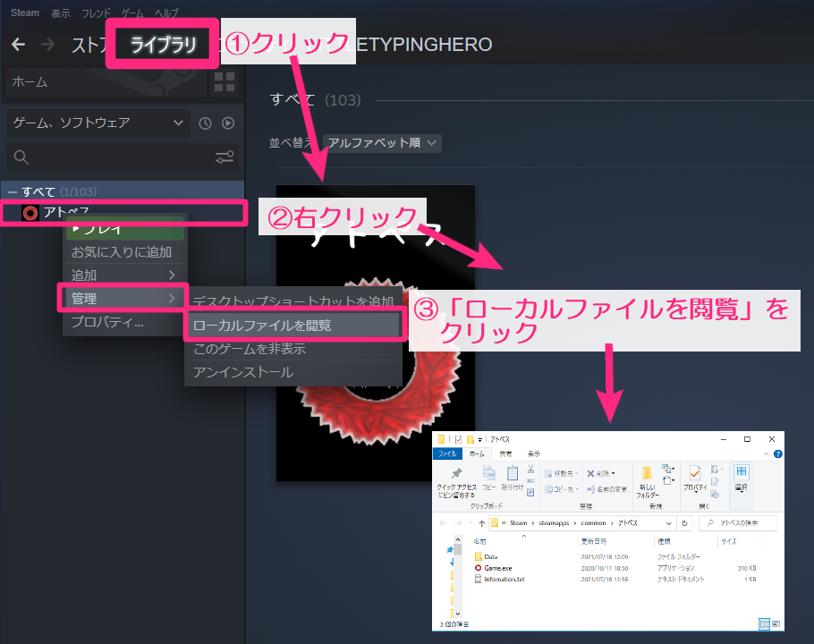 1. Click the Library tab on the top bar of the screen 2. The game selection screen opens on the right side. Right-click on "Atopes". 3. Click Manage → Browse Local Files