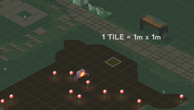 The entire world in split into 1m x 1m tiles. Only one item or factory can occupy a single tile at a time. Even our visuals (the floor environment) are split up into 1x1m tiles. Everything runs off of this tile system, from deciding what footsteps sounds to play, to what item is on that tile.
