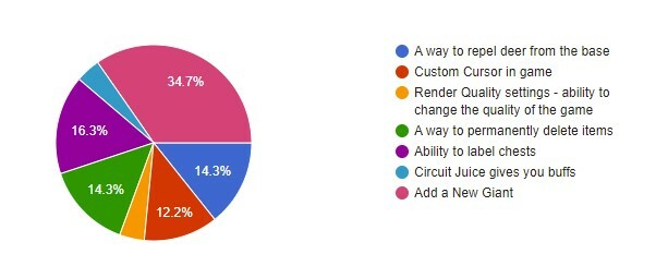 1. Add a New Giant - 34.7% 2. Ability to Label Chests -16.3% And a tie for 3rd! 3. A way to repel deer from the base - 14.3% 3. A way to permanently delete items - 14.3%