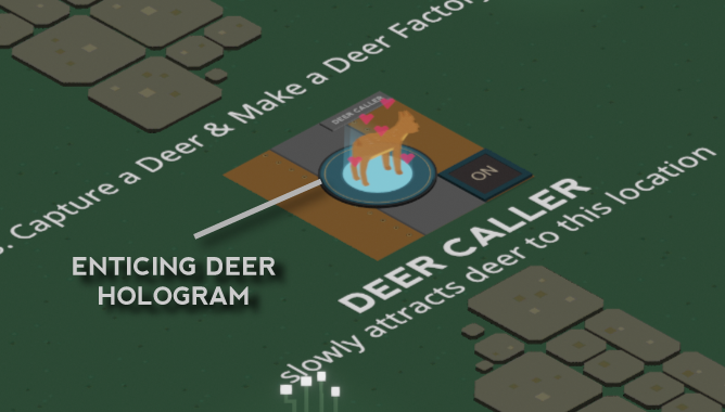 Kitted with a very "alluring" hologram deer, it would call out to other deer for a minute. Deer would slowly start to gather in the area to check out what was happening, and could easily be distracted by tempting "treats" (aka traps to capture the deer).